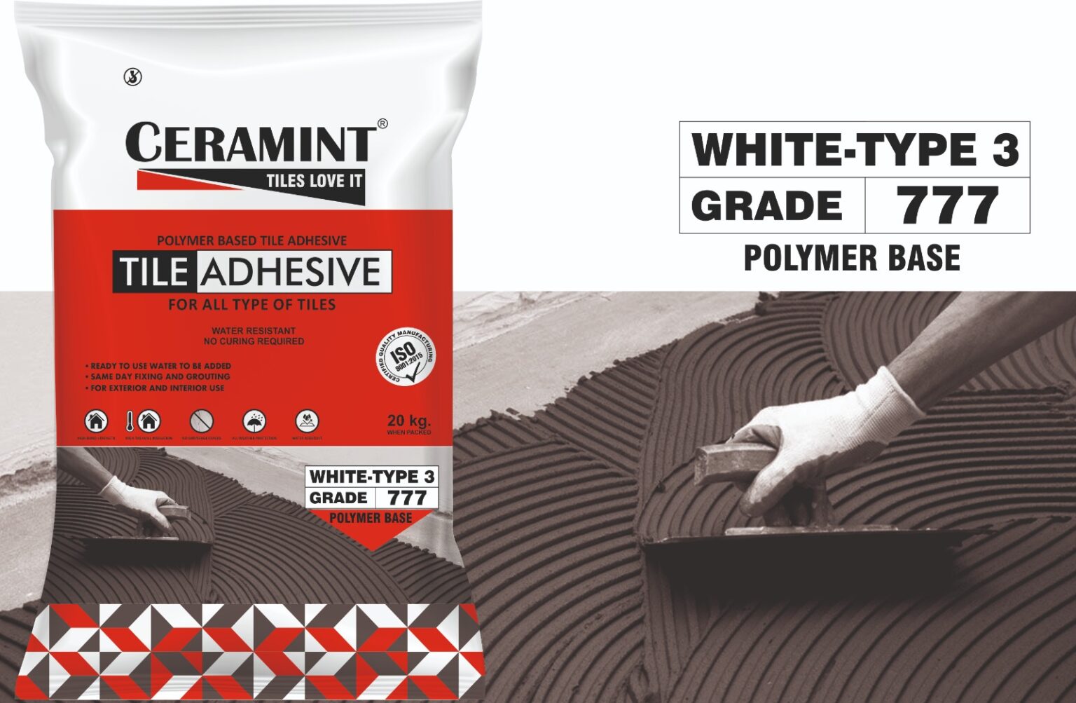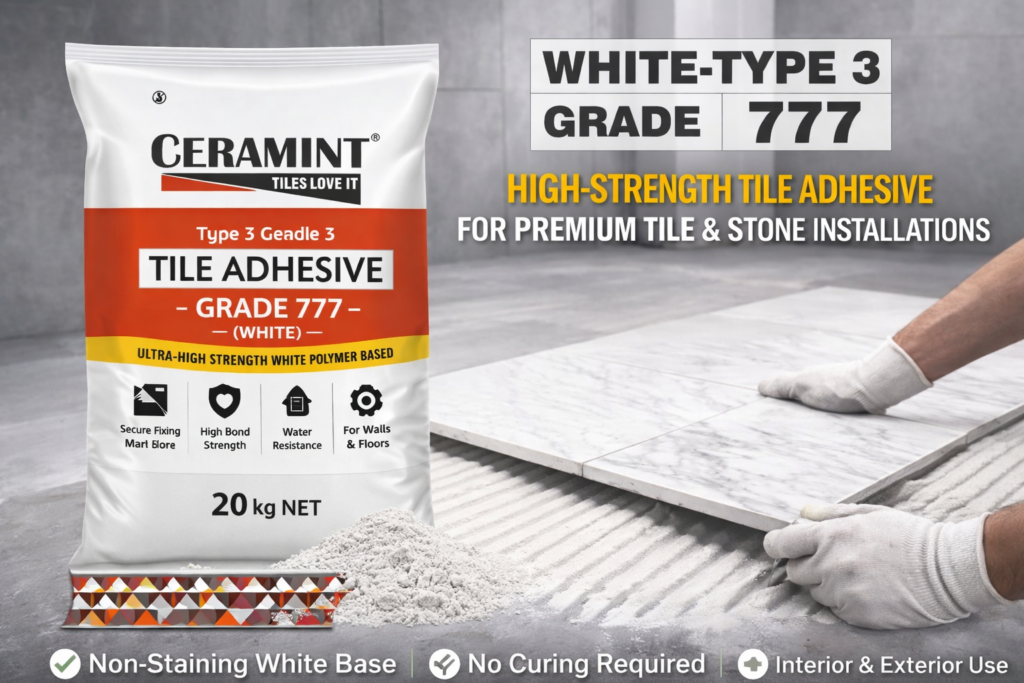 Ceramint Type 3 Tile Adhesive – Grade 777 (White) is a premium, polymer-based adhesive formulated for maximum bonding strength, superior flexibility, and flawless aesthetics. Its white base makes it ideal for marble, granite, natural stone, glass mosaic, and light-coloured tiles where appearance and performance are equally important.